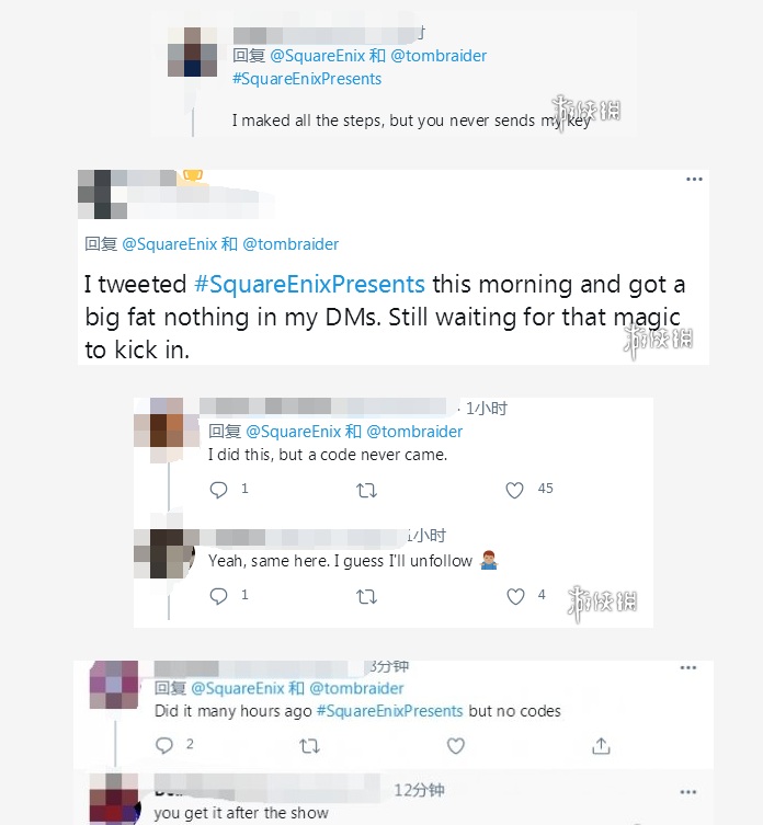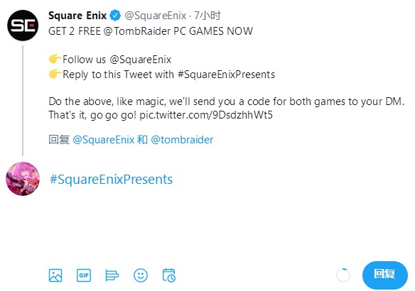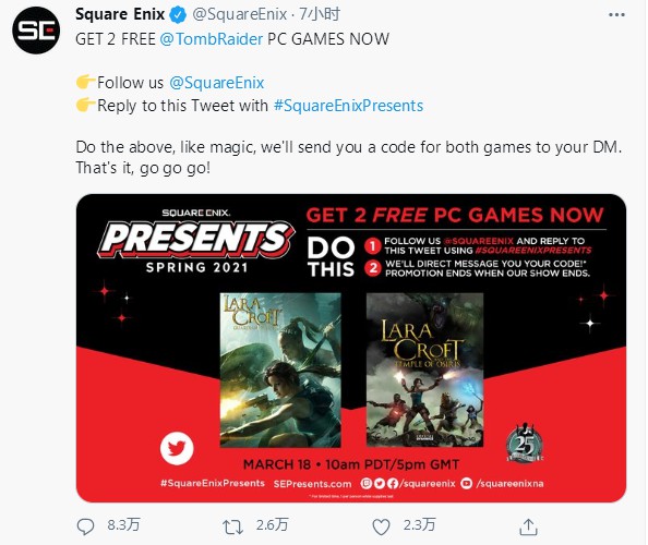 关注SE官方推特→在活动推文下带tag“#SquareEnixPresents”回复,随后官方将通过私信发放《劳拉和奥西里斯神庙》和《劳拉与光之守护者》的Steam码。需要在3月19日凌晨1点的发布会结束前操作才能获得码。