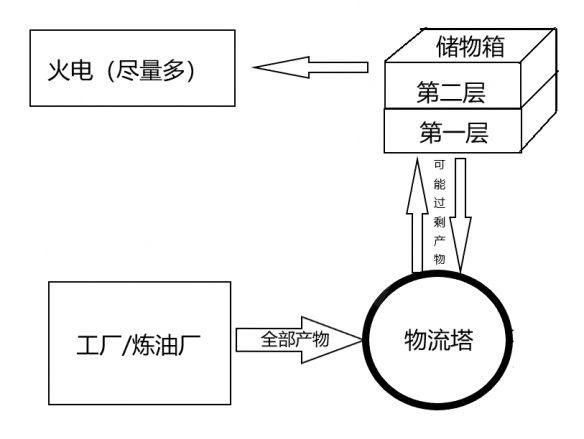 原理:当产物没过剩时,储物箱一边出一边进永远不会满,等于没影响;当产物过剩时,储物箱到物流塔的带子会停住,这时储物箱只进不出,直到塞到第二层,再从第二层出连到火电上烧了。如果需求改变,产物又不过剩了,那么储物箱又会一边出一边进,第二层就永远不会有东西,火电停工。