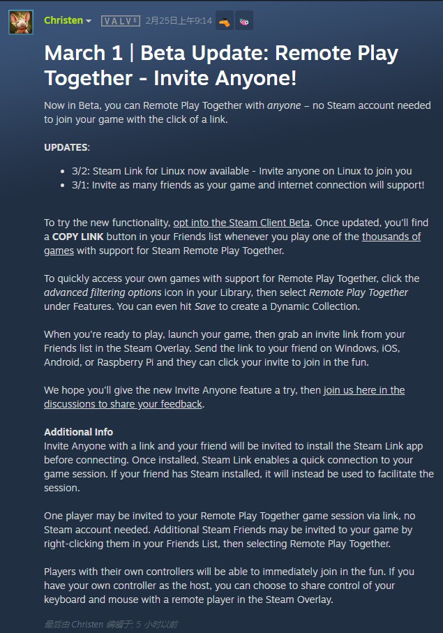 与此同时,Steam Link的Linux版本今日正式发布,允许运行Linux的非Steam朋友加入你的游戏。