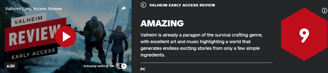 多人生存创造游戏《Valheim:英灵神殿》目前已在steam平台开启抢先体验并收获大量好评,发售两周内便取得了200万销量的好成绩。IGN对本作也进行了评测,并给出了9分的成绩。