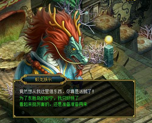 在战斗中,蛟龙会使用回血、闪避、防御等多种技能,但自身气血不高,只要保护好自身血量,就可以轻松将其击败。击败蛟龙之后,玩家得知蛟龙族长谋划夺取东胜岛,大阵即将被冲破。于是,玩家赶忙前往东胜神尊处,收集10块蛟龙麟和一个蛟龙珠助其修复法阵。收集蛟龙麟只需要触发在地图中随意走动,触发与小妖蛟龙的战斗就可以获得,而龙珠只有蛟龙族长才能拥有。