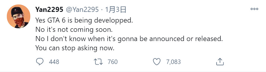 Yan2295发布了推特表示,《GTA6》确实在开发中,但不会很快到来,他本人也不知道R星何时公布或发售《GTA6》,并且请求粉丝不要再问这些问题了。