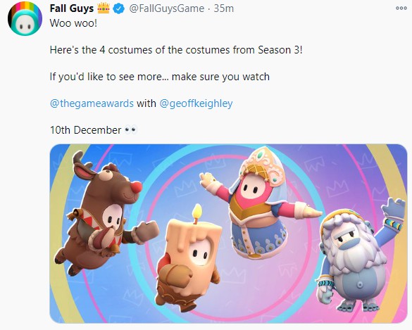 《糖豆人:终极淘汰赛》官方推特今日放出了游戏第三季的部分皮肤外观,并表示如果大家想要看到更多(皮肤),别忘了届时收看TGA颁奖典礼。