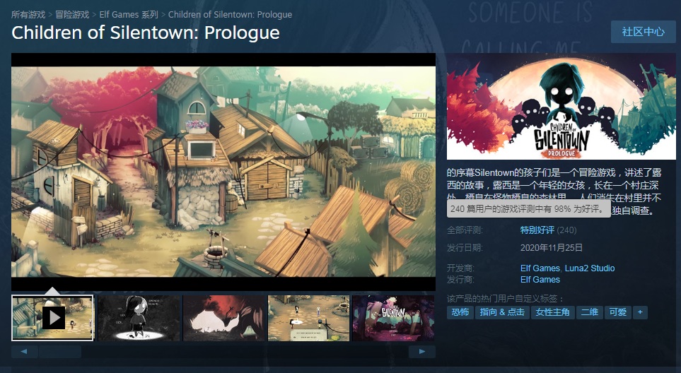 由Elf Games和Luna2 Studio开发的恐怖冒险游戏《寂静小镇的孩子们:序章(Children of Silentown: Prologue)》现可在Steam免费游玩,游戏好评率98%,不支持中文。喜欢恐怖冒险类游戏的小伙伴可以加入《加速器特权网》体验哦!