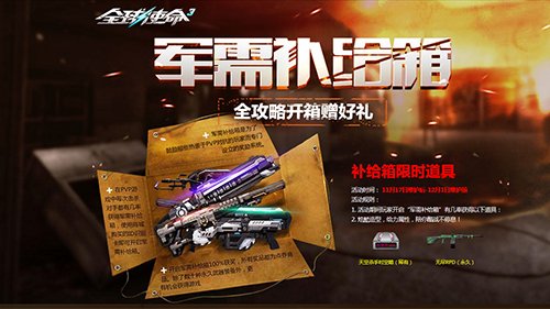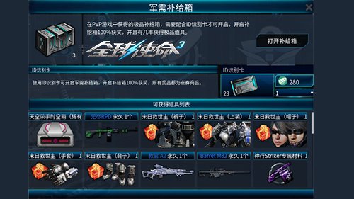 军需补给箱是为了鼓励那些热衷于PVP对抗的玩家而专门设立的奖励系统。在PVP游戏中每次击杀对手都有几率获得军需补给箱。需要注意的是,补给箱默认为加密状态,需要使用“ID识别卡”打开,该道具不仅商城有售,平时还将通过活动免费发放给广大玩家。使用ID识别卡即可开启军需补给箱。开启军需补给箱100%获奖,所有奖品都为点券商品。除了数十种永久武器装备外,更有机会获得带属性的游戏时装。
