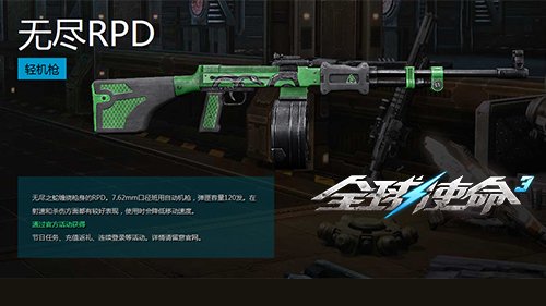 “无尽RPD”枪身纹有绿色蛇纹。在其神秘、炫酷的外表下,无尽RPD是一把7.62mm口径班用自动机枪,弹匣容量120发。尽管使用机枪会略微降低玩家的移动速度,但其在射速和杀伤力方面都有较好表现。升阶至紫色品质的无尽RPD Mk.5后,弹匣容量增加30%,且对灵能敌人增加伤害40%。拿着这把升阶武器,在战斗中的威力还是不容小觑的。