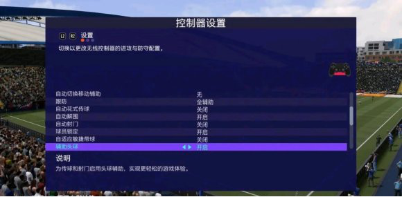 辅助头球:开启 (开启后有系统辅助,头球相对轻松一些。如果你喜欢手动,可以选择关闭)。