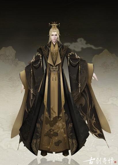 成男款层叠的衣袖充满质感而不繁重,精巧金饰覆于广袖之上,暗纹隐隐流光,与长衣相配,潇洒俊朗,将男子的身姿衬得愈发挺拔。