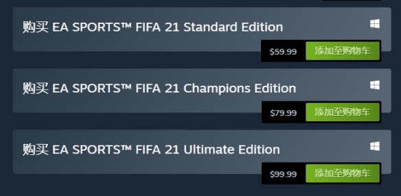 《FIFA 21》标准版售价469港元(约405.15人民币)/59.99美元(约401.63元);冠军版售价629港元(约543.37元)/79.99美元(约535.53元);终极版售价789港元(约681.58元)/99.99美元(约669.42元)。游戏支持中文音频。