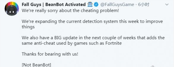 《糖豆人:终极淘汰赛》官方推特说明:“对于作弊的问题,我们真的很抱歉!本周我们正在扩大现有的检测系统以改善情况。在接下来的几周内,我们还会有一个大的更新,增加类似《堡垒之夜》所使用的防作弊功能。”