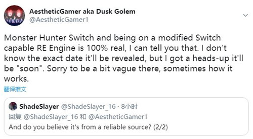 经常爆料卡普空相关情报的“舅舅党” Dusk Golem,今天(9月5日),再次在推特上肯定了Switch版《怪物猎人》的存在,并表示该作使用RE引擎开发。
