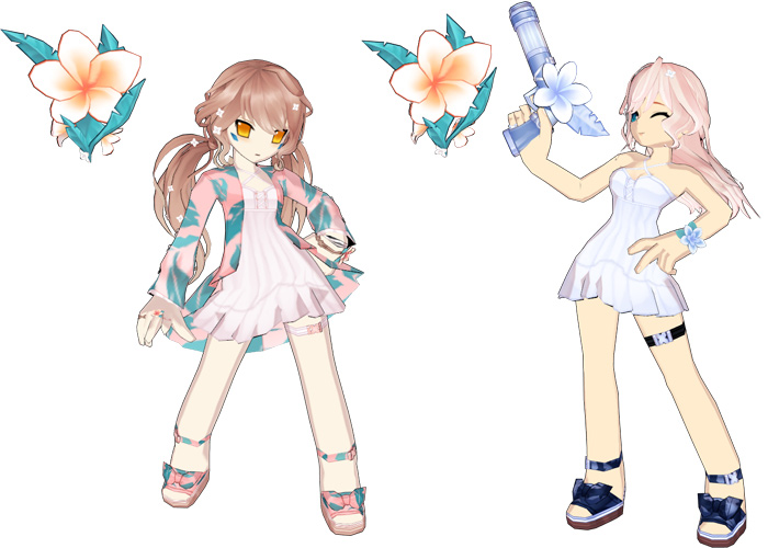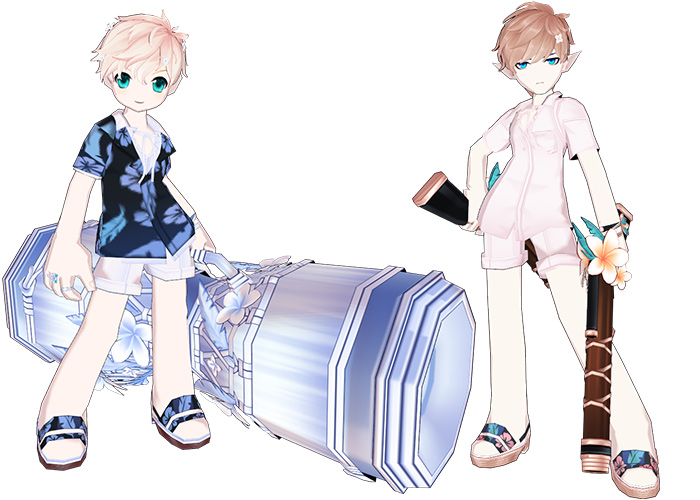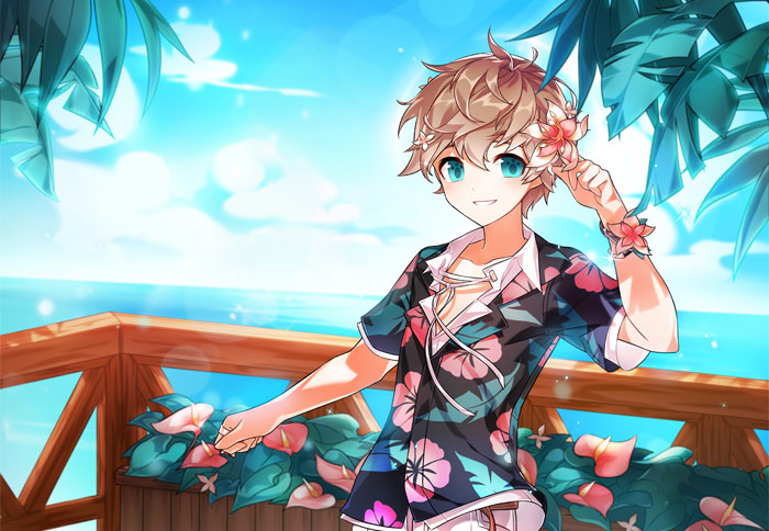 该套时装的原画立绘选用了超级可爱的男孩子“澄”作为展示对象,时装共有两种颜色可供玩家们选择,而且稀有礼包内还额外增加了一个上衣装扮,度假风十足的花外衣,亦或清爽的内搭样式,都赚足了玩家的眼球。
