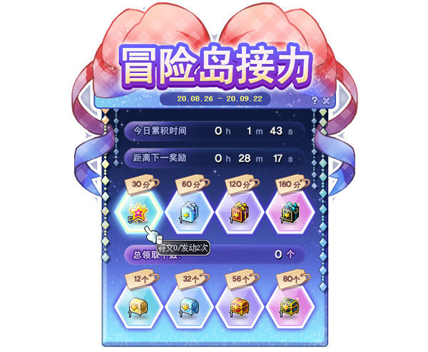8月26日至9月22日,玩家可以接取【冒险岛接力】与波波一起玩耍,领取登录奖励吧!任务,达到对应的条件,就能获得每日上线奖励和累积上线奖励。