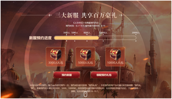 8月17日至9月15日,新老玩家均可进行新服预约,预约成功即可获得预约礼包。此外,新服预约总人数达到3000人、5000人、10000人时,所有的预约玩家均可均可额外获得礼包。礼包不仅包含精品道具如各类召唤卷轴治疗药水、魔法药水等,还有永久绝版道具以及神秘奖励。