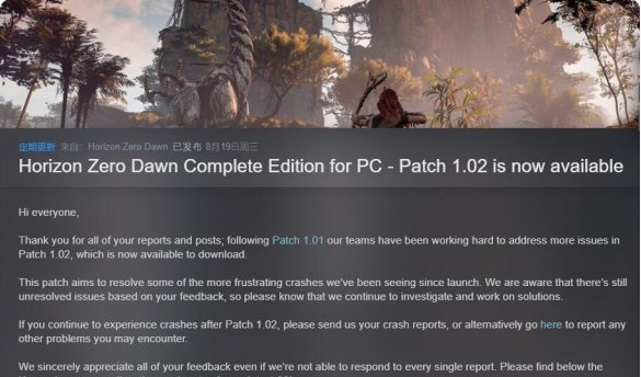 Steam好评率仅61%的《地平线:零之曙光》昨晚推出了1.02补丁,这次修复了多个崩溃问题,如内存错误重写、材质unstreaming错误、面部动画不同步等。官方表示目前依然还有不少玩家反馈的问题没解决,他们会继续努力。