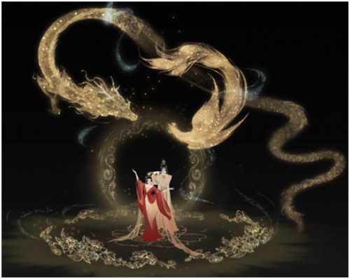 展羽衣,舞霓裳,龙祥音,凤来仪。轻纱、织锦材质,点缀龙凤和牡丹刺绣,华丽非常。
