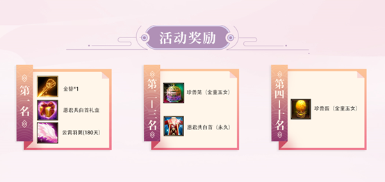 当告白情书累计获得50个、100个点赞时,可以额外分别再次获得1次抽奖机会,并在活动结束后,被点赞数排名第1名、第2-3名、第4-10名的告白情书可分别获得对应奖励,第1名的玩家还可获得【天龙宋制定情金簪】奖励!