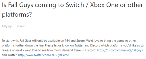 据开发商Mediatonic介绍,《糖豆人:终极淘汰赛》今后也有可能登陆XboxOne、Switch,乃至手机。也许是因为询问其它版本的玩家太多,《糖豆人:终极淘汰赛》的官方帮助页面专门对此问题进行了回答: