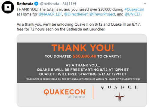官方表示:非常感谢各位玩家,QuakeCon 2020慈善筹款金额已经突破了3万美元,为了向大家表示感谢。我们决定将于8月13日零点开启《雷神之锤2》免费领取活动,8月18日零点开启《雷神之锤3》免费领取活动,此次免费领取活动限时72小时,玩家们可以通过bethesda平台领取这两款游戏。