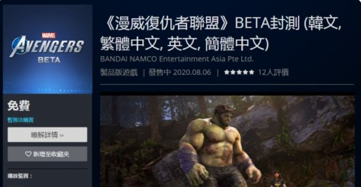 动作游戏《漫威复仇者联盟》即将于明日(8月7日)在PS4平台开启BETA封测,目前游戏的测试版已上架PS4港服商店,游戏支持中文,测试版大小为26.4G。 【官方介绍】