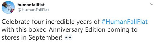 “庆祝《人类:一败涂地》令人难以置信的四年,周年纪念实体版将于9月上架!”