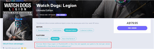 育碧的《看门狗:军团》官方预购页面显示:在PlayStation®4或Xbox One上购买《看门狗:军团》,并将您的游戏升级到次时代版本(PlayStation®5或Xbox Series X),无需支付额外费用。