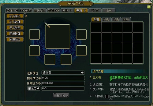 天书系统还可以在鬼斧神工宠物II页面中进行强化、继承和转换等操作。其中,等级大于100级且品质为蓝、金的天书可以对基础属性进行强化和提高,一次最多可放入6个辅助天书,且强化后辅助天书消失,而基础数值将得到一定程度的提高。另外,如果玩家对随机生成的基础属性不满意,则可以通过天书转属功能将不满意的属性替换,也就是天书转属操作。