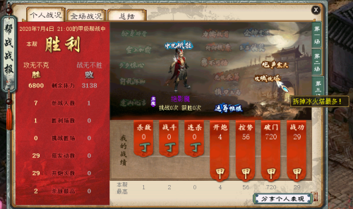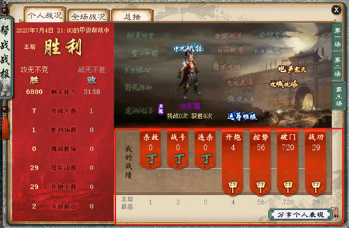 “连杀”,是指该场战斗中连续杀敌队伍数的最高值;“破门”是指队伍对城门实际造成的扣血总数;而“战功”则是指最终可能获得的战功数量。同时每项指数下方还有帮派单项最高值作为参考和目标!(甲乙丙丁的等级评价,是指单项数值在整个帮派内的大致排名情况。)