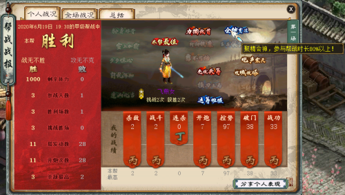 帮战评价页面分为个人战况及全场战况,在个人战况页里,每位玩家都可以清楚的看到自己单周在帮战中的实际表现。