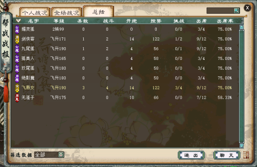 除了个人页面外,新增的全场战况中清楚的展示了每位玩家的帮战数据,同时也包括每位玩家所获得的战勋显示。点击人物名称即可查看个人具体战况,并且可以通过点击聊天按钮来和每位玩家进行快速交流。