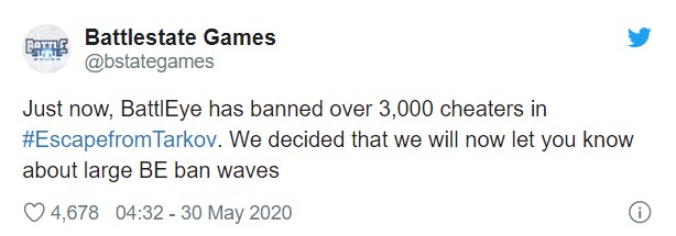 据报道,该反作弊系统BattlEye还被应用在《彩虹六号:围攻》《绝地求生大逃杀》《武装突袭3》等众多大型在线游戏中。BattlEye在上线的第一天(5月29日),便封禁了超过3000名的作弊玩家。开发商BattleState表示将会公布被封禁玩家名单,未来还将继续加大力度整治作弊行为。