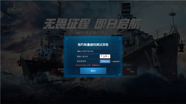 二、玩家可以在《战舰世界》官网预约页面点击“立即预约”按钮,随后输入“手机号”、“相关验证码”及“战舰世界游戏账号”进行预约。
