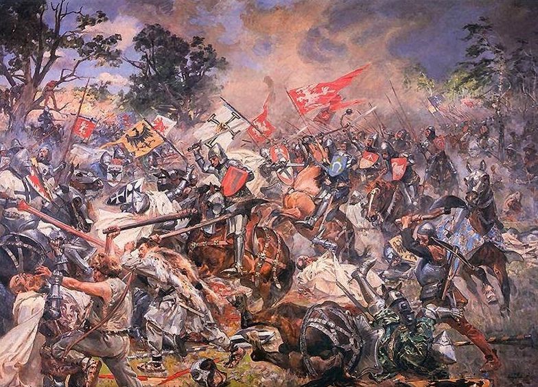 但胜利女神没有长长久久的眷顾条顿骑士团,在1242年的楚德湖战役中,因为作战场地的缘故重装骑兵没有办法在脆弱的冰面上大展身手,结果损失惨重元气大伤。而面对依旧强大的条顿骑士团,小邦国开始抱团防止被他们吞并。1410年的格伦瓦尔德会战是欧洲中世纪历史上规模最大的一次骑士战役,后世史学家曾记载双方骑兵部队战旗数量达到了141面之多,还不包括其他的步兵部队(长枪兵、弓箭手、弩手和盾兵)。在这场战役中,条顿骑士团搬出了他们的黑科技——野战弩炮,无奈小雨将他们的火药淋湿,整场只打出两发。波兰重骑兵从左翼突破骑士团防线,协同立陶宛骑士队击溃了条顿骑士团。从此条顿骑士团一蹶不振,走向衰弱。