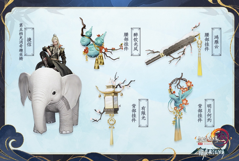 此外,侠士们于5月14日7:00至6月18日7:00参与充消活动,可根据充消金额获得腰部挂件“醉饮光风”、背部挂件“明月何灼”、腰部挂件“鸿雁云”、背部挂件“有限光”以及第五档充消奖励——小象奇趣坐骑“捷信”!