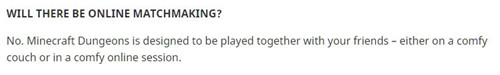 《我的世界:地下城》自公布后便受到众多玩家关注,这是一款全新的动作冒险游戏,玩家将能体验到类似《暗黑破坏神》打怪刷装备的乐趣,并能与最多3名玩家一起组队行动。近日据官方问答(FAQ),玩家在新作中无法与随机队友组队。
