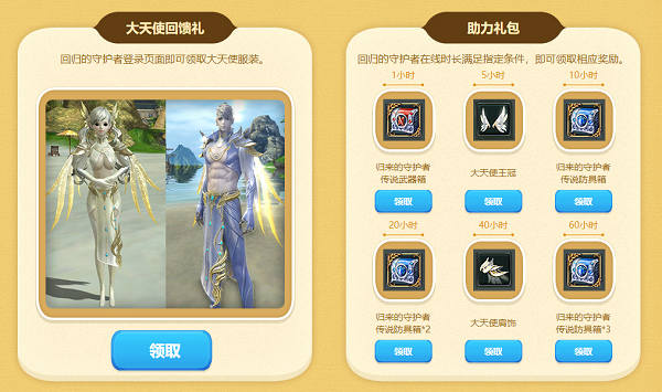 满足回归条件玩家均可参与活动领取多重专属好礼。精美回归外观、游戏实力装备等你领取。海量回归好礼,登录即可获得经典外观“大天使服装”。满足游戏在线时间还将获得助力好礼:专属归来的守护者装备箱。回归的守护者达到满级,即可领取[活动]B级2阶段宠物精灵契约书(4种)。多重福利助力回归玩家成长,再返战场重燃战斗热情!