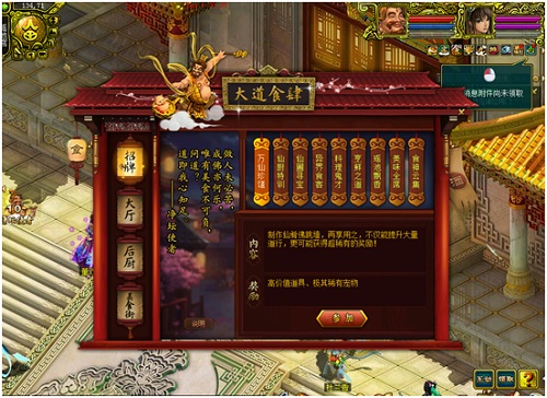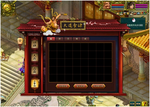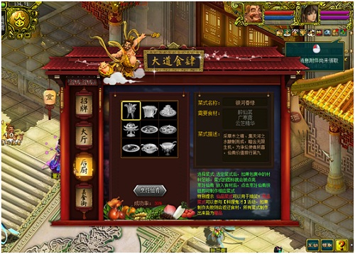值得注意的是,制作出仙品菜式可以用于大厅内的抽奖,异品菜式可以参与“料理鬼才”活动,如果制作失败则会返还食材,所有的菜式制作出来皆为赠品。说到“料理鬼才”活动,就不的说一下“大道食肆”的美食街界面了。