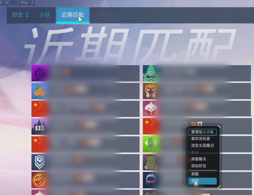 在游戏后按“O”键后在左上方选择“近期匹配”栏,接着找到外挂玩家的账号,同样对他的头像点击右键进行举报。