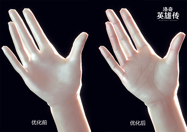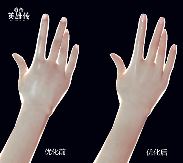 从对比图中可以看出,在原本手部模型的基础之上添加了关节与掌纹,皮肤光滑度与光效方面也进行了调整,使其更贴近于现实。