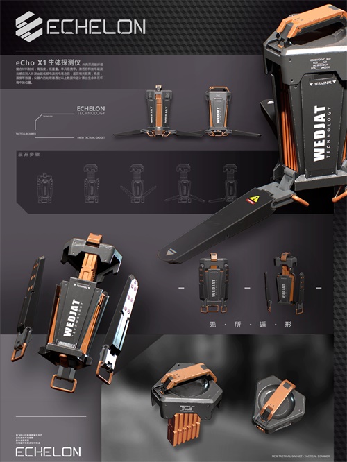 尽管隐身衣可以让你随意穿梭在敌人身侧,但世间万物总有相克。在研发“Spectral W1光学斗篷”的同时,Echelon也留下后招,一款脉冲侦测装置“eCho X1生体探测仪”便是光学斗篷最佳的克制手段。在激活装置之后,探测仪会释放电磁波,主动感应人体发出的超低频电波电场,从而准确测出生命的位置,让身穿隐身衣的敌人无所遁形。除此之外,“eCho X1生体探测仪”采用碳纤维复合材料,强度高、重量轻、易携带,可以随时随地使用,很好得克制了“Spectral W1光学斗篷”。二者就如同一支直插敌人心脏的长矛与一面全方位保护的盾牌,矛盾之战孰强孰弱全看使用者的功力了!