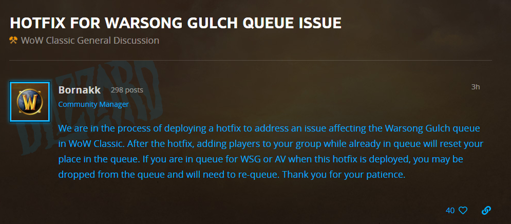 《魔兽世界》官方今天发布蓝贴,宣布将会对怀旧服战歌峡谷战场的排队问题进行修复,在线修正补丁将会在近期上线。