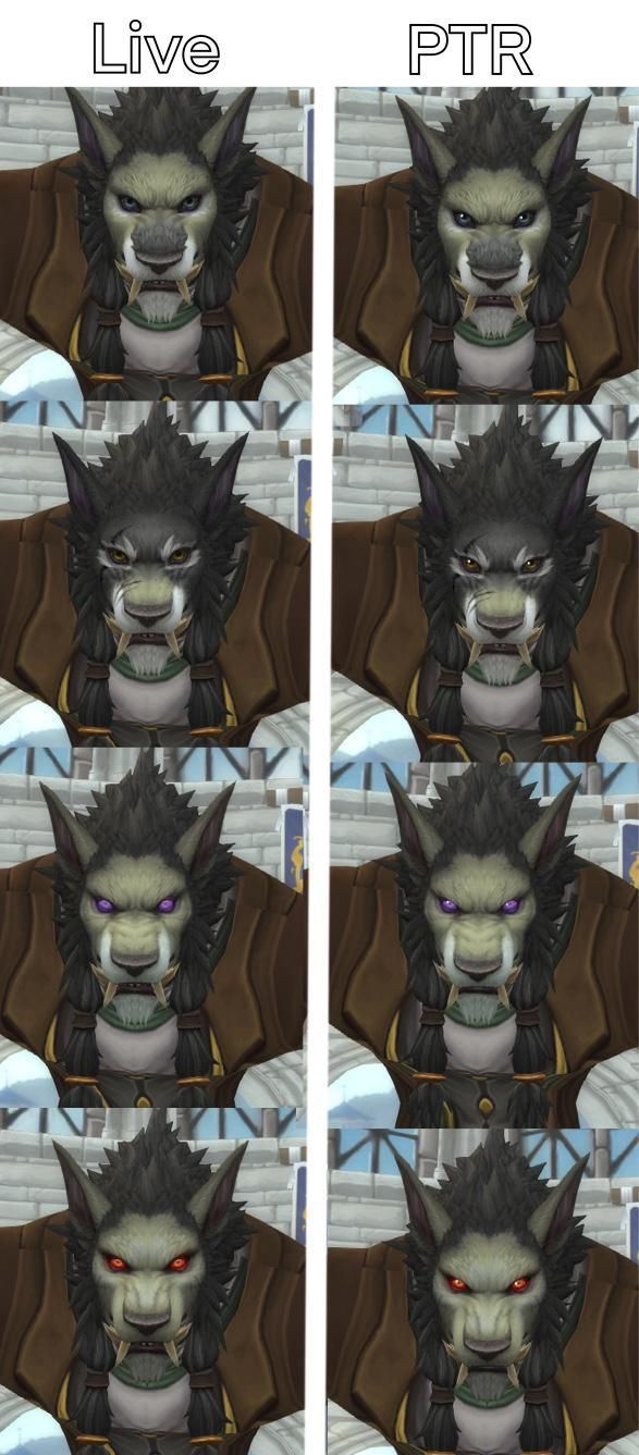 和正式服模型对比,PTR中的眼睛更加接近现实中的人类眼睛,带着光芒。加上8.2.5版本为了推出狼人传承护甲给狼人种族进行了模型更新,新版本的狼人模型更为柔和,在野性的外观下更加具有人的感觉。 此次暴雪在8.3版本大幅度地更新角色模型,很可能是为了给接下来的8.3版本和9.0版本剧情作铺垫。至于是否如此,还需要等待正式服上线。