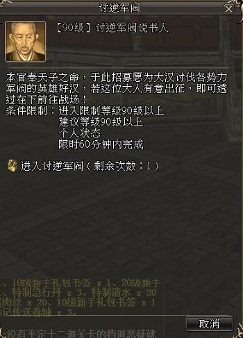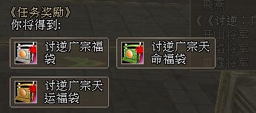 “讨逆:广宗”任务也需要击杀三个BOSS:开山将军、流焰将军以及雷霆将军,任务完成后可获得大量经验、金钱以及三个福袋奖励。其中讨逆广宗福袋可开出优质精钢、优质神铁、花黎项链配方、战狼转职令、女弓兵转职令、杀手转职令等;讨逆广宗天命福袋可开出溯金刀、玉刃圈、伏魔鞭、骁勇令牌等;讨逆广宗天运福袋可开出雀翎短披风、骁骑腰带、太玄鞋等。