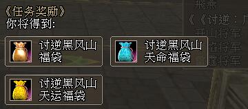 “讨逆:黑风山”任务需要主公击杀三个BOSS:方莽、虯髯、以及狂暴褚飛燕,全部击杀完成任务后可获得大量经验和金钱,同时还会得到三个任务福袋。每个福袋打开后都可获得一件随机奖励,其中讨逆黑风山福袋可开出正规兵技能书、七星转命术决、短兵斗气术决、战意术决、大刀兵转职令、长弓兵转职令、铁盾兵转职令等;讨逆黑风山天命福袋可开出三叉戟、镇冥杖、紫金扇、义勇令牌等;讨逆黑风山天运福袋可开出穷奇头盔、日月头冠、浮虚头冠、义勇令牌等。