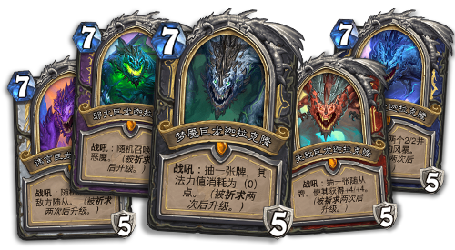 从这次扩展包的标题就能看出,“巨龙降临”中我们会迎来一大波的全新龙牌。其中最为瞩目的就是传说级始祖龙——迦拉克隆。那些与怪盗军团结盟的玩家将有机会复活迦拉克隆,根据自己的职业(牧师、术士、潜行者、战士和萨满)化身为迦拉克隆的五种形态之一。而当你首次打开“巨龙降临”卡牌包时,你将免费获得所有5张迦拉克隆牌。