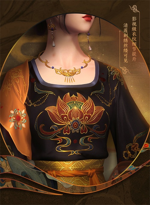 该套外装揉合了敦煌元素与清莲纹样,更使用全新黑科技——升级中的影视级衣纹效果,再现传统服饰材质的细腻质感。