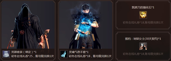 在11月19日(维护后)至12月10日(维护前),每日每累计在线30分钟,将通过邮件获得1张“初冬在线礼券”(每日累计最多获得4张),英雄们可使用礼券于兑换商店中获取“死神套装(绑定)”、灵魂气息手套等道具哦!