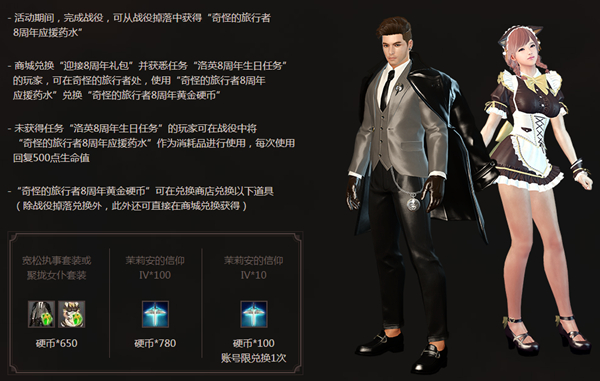 在11月19日维护后至12月17日维护前,英雄们可于战斗中获得“奇怪的旅行者8周年应援药水”,若是英雄于商城中兑换“迎接8周年礼包”并获悉“洛英8周年生日任务”,可将“奇怪的旅行者8周年应援药水”于奇怪的旅行者处兑换“奇怪的旅行者8周年黄金硬币”,英雄们可使用“奇怪的旅行者8周年黄金硬币”在商城中换取宽松执事套装&聚拢女仆套装、茉莉安的信仰等珍稀道具哦!(“奇怪的旅行者8周年黄金硬币”还可于商城中兑换)