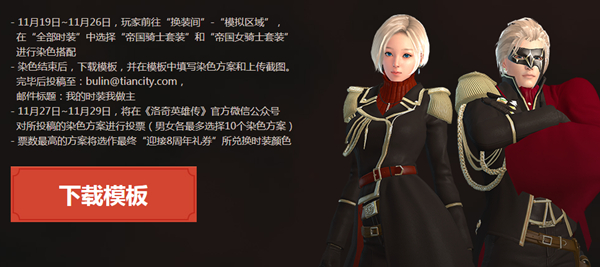 11月19日至11月26日,英雄们前往“换装间”-“模拟区域”,可在“全部时装”中选择“帝国骑士套装”和“帝国女骑士套装”进行模拟染色搭配,按照指定的要求及步骤参与活动,就有机会让“迎接8周年礼券”所兑换的时装颜色为你所设计哦!