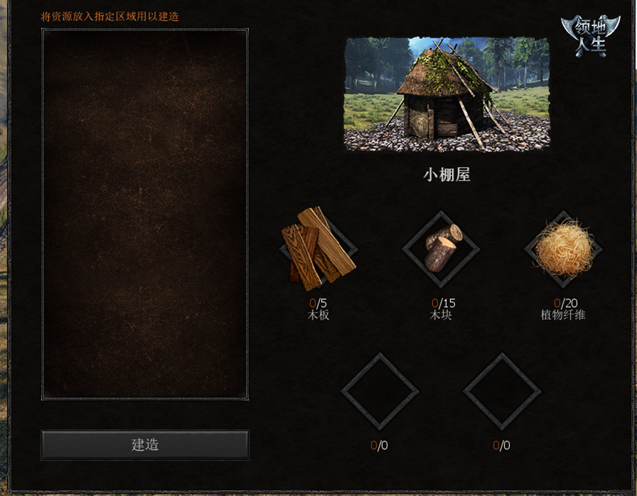 在等待的期间,我们可以考虑下自留地的规划。插一把小宝剑建立一块私人区域,筹备我们的第一个建筑——小棚屋。小棚屋虽然看上去简易,但是毕竟是在阿贝拉大陆上一个容身之处。《领地人生》中,所有的建筑物都需要建立在平整的地面上,为了以后的长期发展寻找一片相对比较平整的地面可以大大节约平土所需的时间。小棚屋的建设面积为4×4的土地面积,平完土地后挑选一个良好的朝向建造小棚屋,我们可以看到建造所需要的材料有木板木块与植物纤维,木块可以通过伐木斧劈、木板可以通过锯子锯木头获得,植物纤维则直接地上搜寻即可。有了小棚屋我们可以在里面制作一些板条箱去存放材料,也可以存放一些材料和种子。